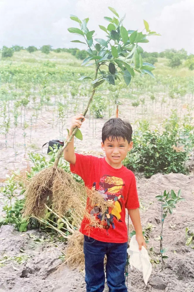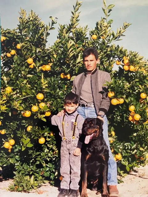 Hi! I'm Danny, founder of Via Citrus—and yes, that's me in 1992 sporting those ultra rad Batman suspenders. Standing next to me is my Dad, Joel, on our farm in Central Florida. My earliest memories are running through these orange groves on our farm in Central Florida, the result of my Dad's lifetime passion for cultivating citrus.